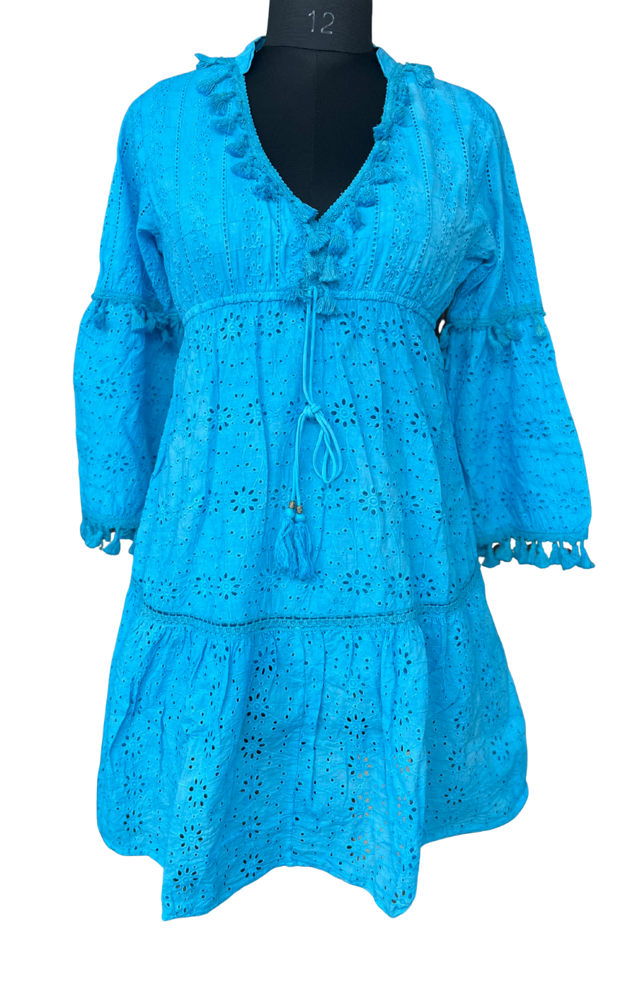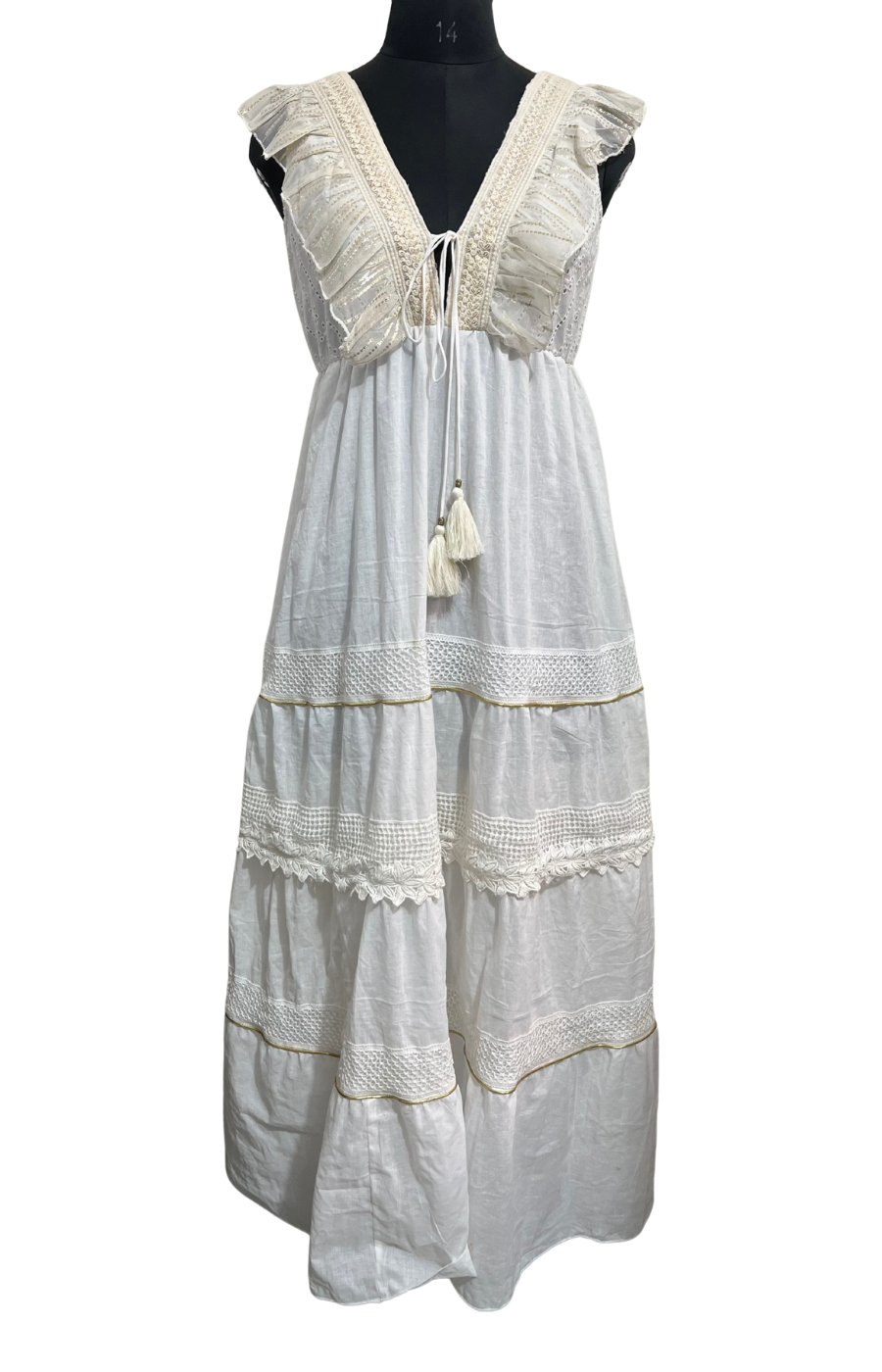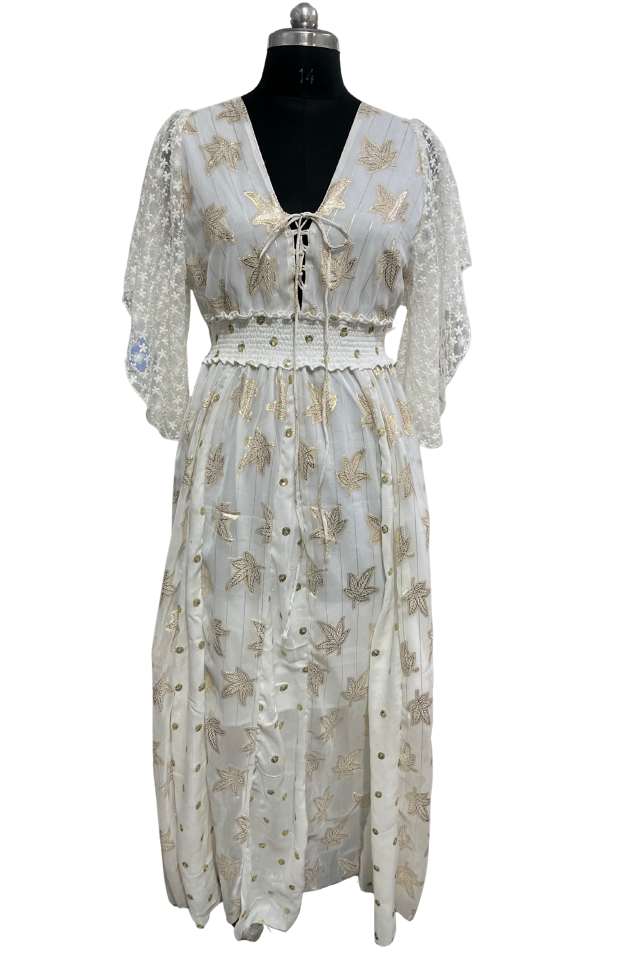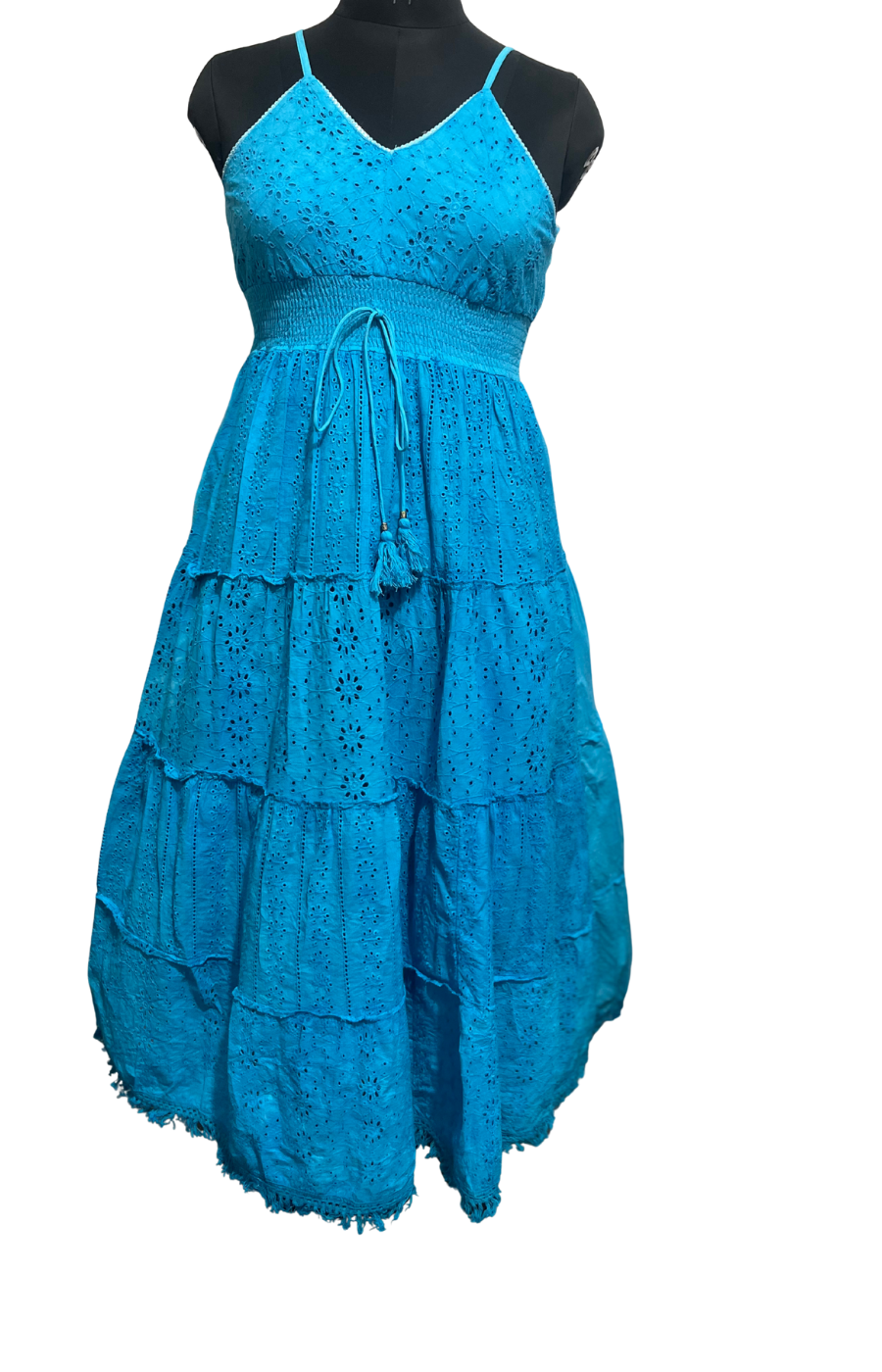 A delicate Schiffli dress featuring intricate cut-work embroidery that adds an elegant, textured, and feminine look.
