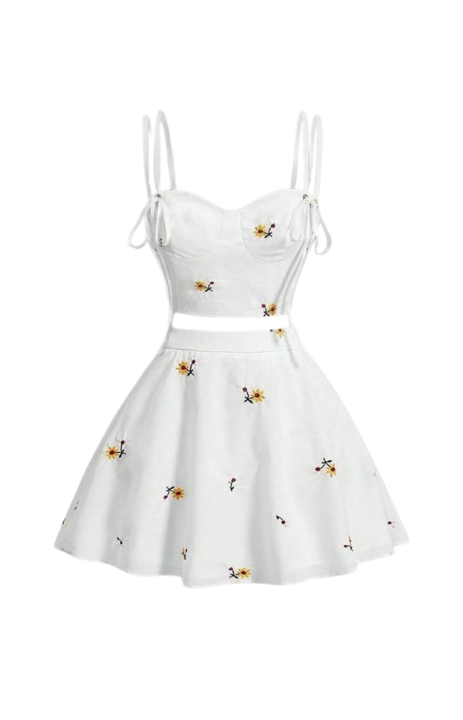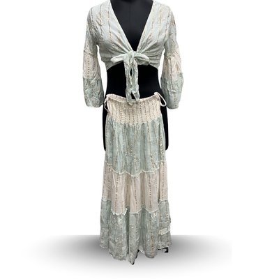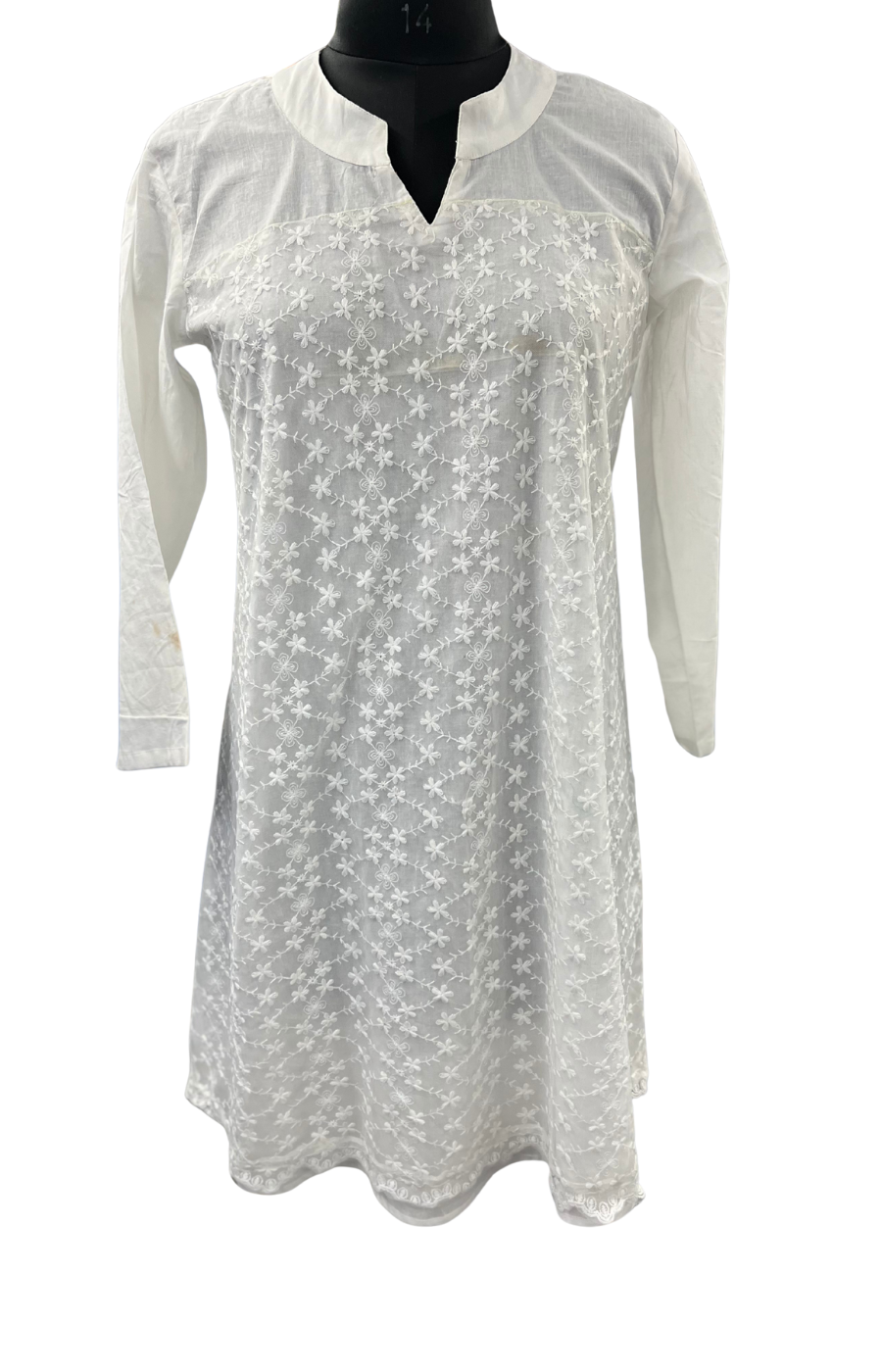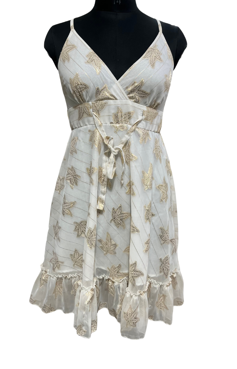 A delicate Schiffli dress featuring intricate cut-work embroidery that adds an elegant, textured, and feminine look.